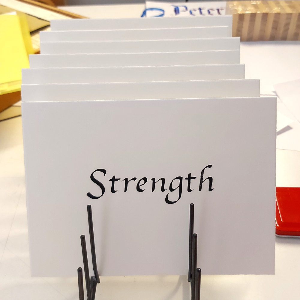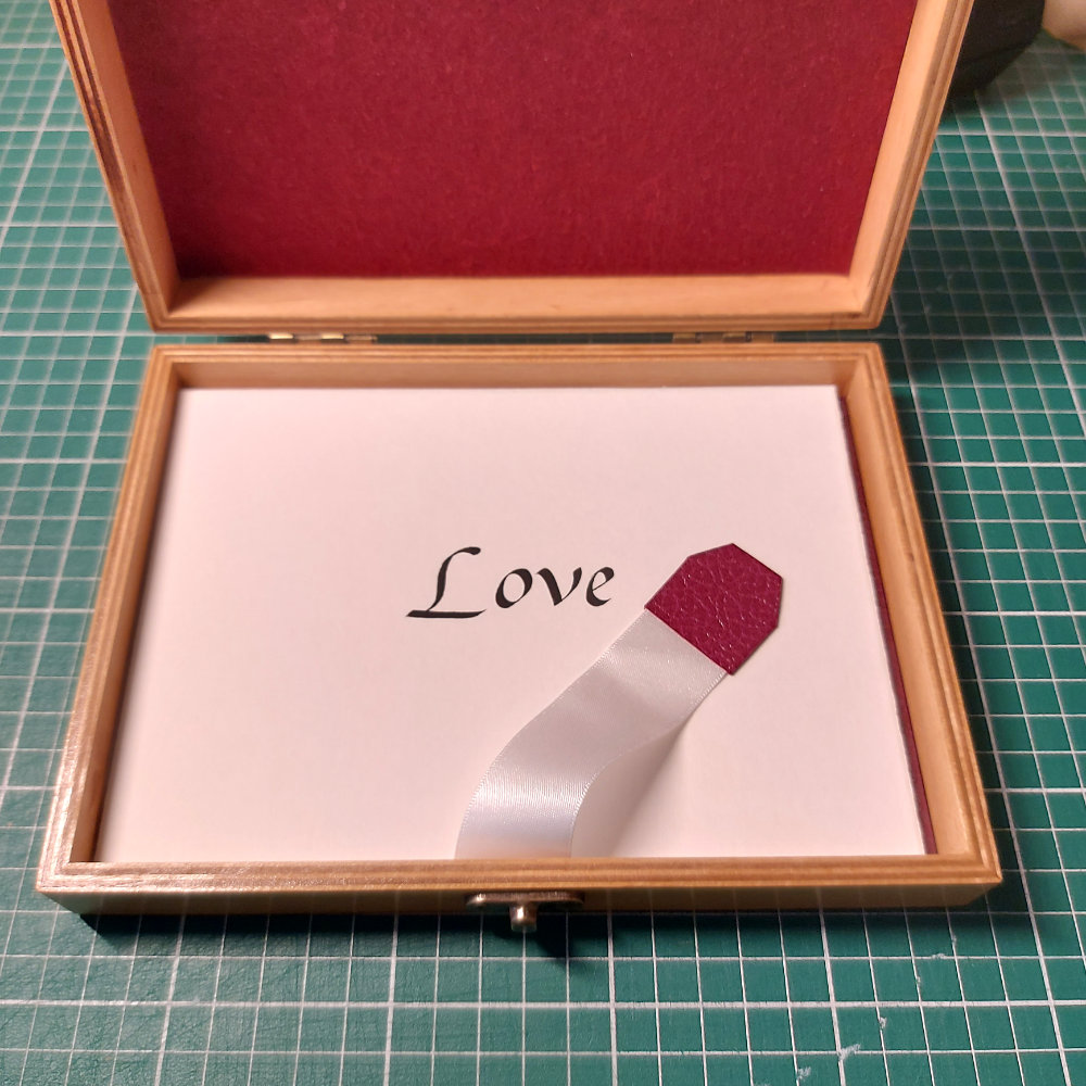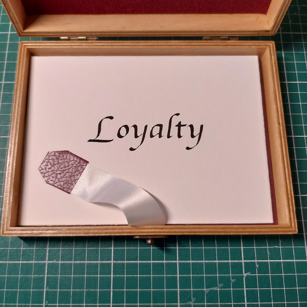Deze bijzondere opdracht ontstond uit de wens van de opdrachtgever om een vrouw op een bijzondere manier ten huwelijk te vragen. Een elegant rood doosje met daarin zes met de hand geschreven kaarten in sierlijke kalligrafie. Op de achterzijde van elke kaart staan liefdevolle redenen waarom dit de vrouw is met wie hij wil trouwen. Een object dat persoonlijker is dan een standaard cadeau. Het resultaat is een zorgvuldig handgemaakt kalligrafisch object, uitgevoerd op authentiek geschept papier.