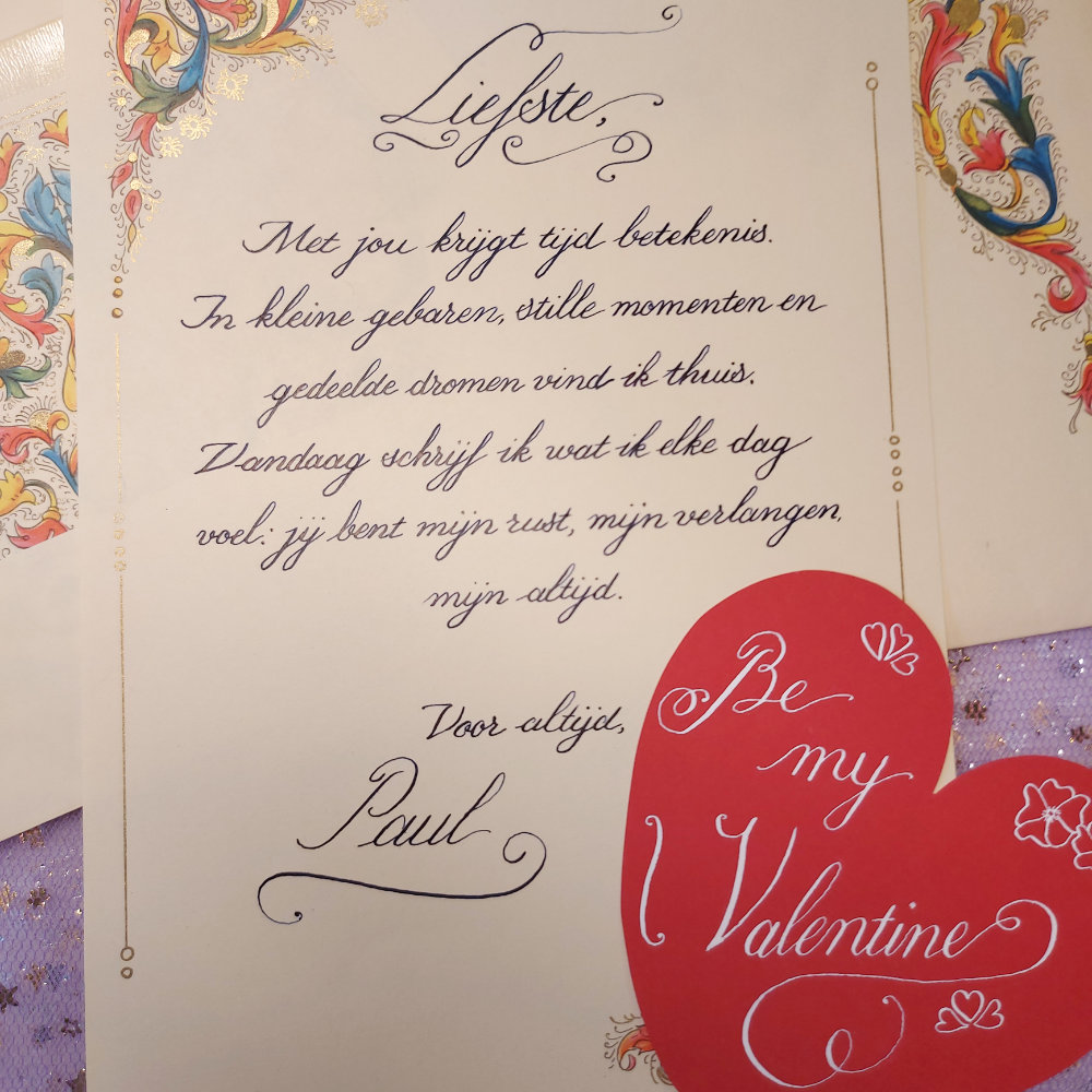 Valentijnsdag 14 februari is de perfecte gelegenheid om de liefde te vieren – met woorden die rechtstreeks uit het hart komen. Wij maken van jouw boodschap een echt kunstwerk. Een persoonlijke liefdesbrief, een elegante kaart of een prachtige spreuk: wij geven jouw woorden de aandacht die ze verdienen.